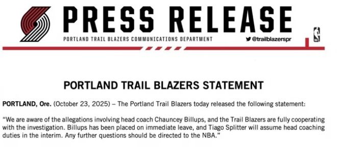 隨后,開拓者官方緊急發(fā)表聲明,宣布立即暫停比盧普斯的主教練職務(wù):